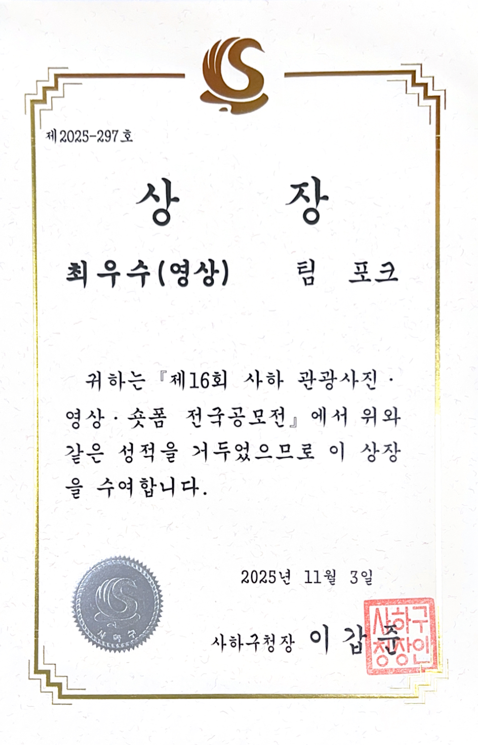 제 16회 사하구 관광사진, 영상, 숏폼 전국공모전 '최우수상'