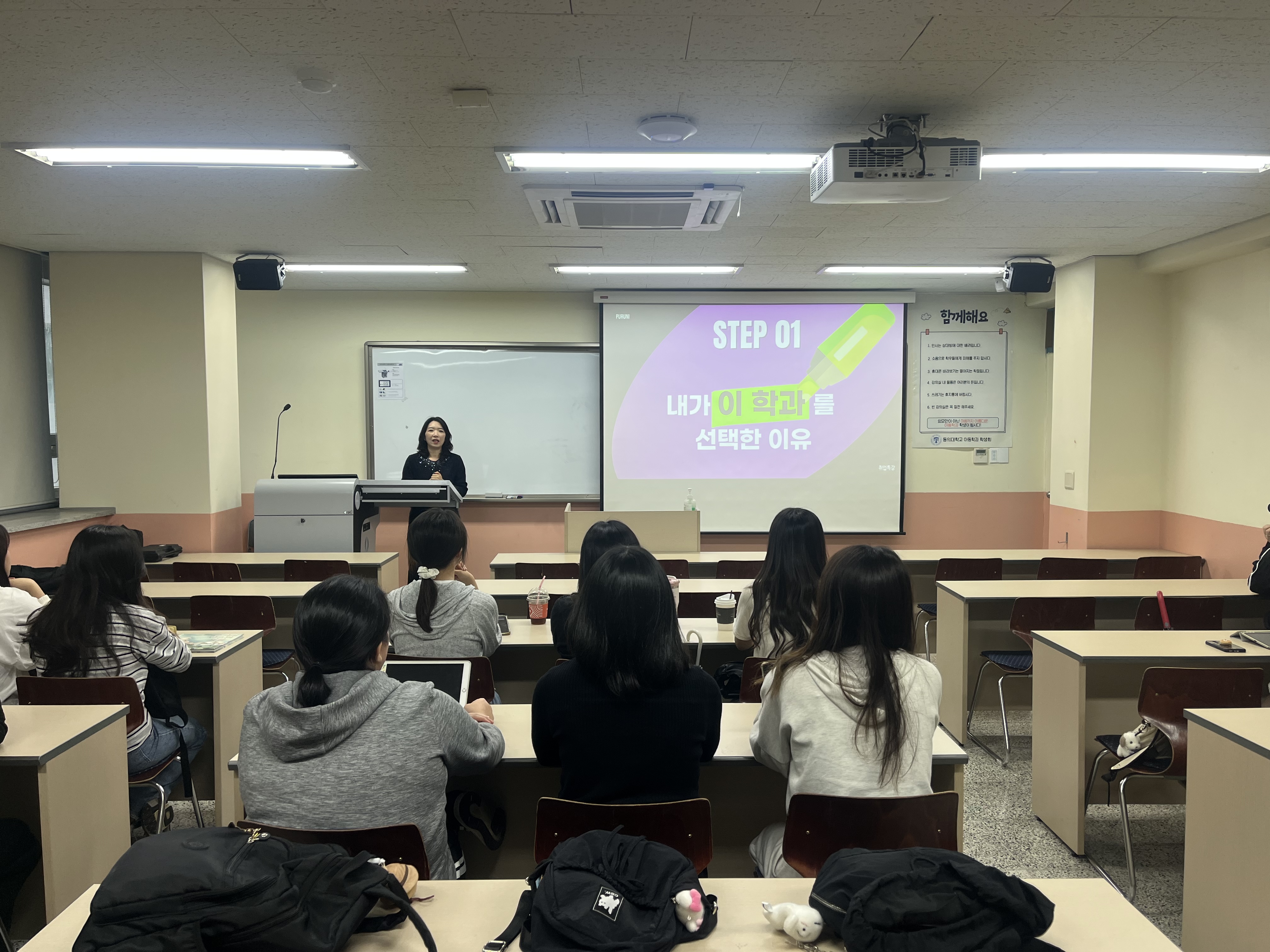 2025학년도 2학기 산업체 전문가 멘토링 프로그램 1회차에서는 푸르니보육지원재단 변선영 본부장님을 모시고, 보육현장의 전문성과 취업 준비 방향에 대해 알아보는 뜻깊은 시간을 가졌습니다. 이번 특강에서는 푸르니보육지원재단의 설립 배경과 보육 프로그램, 운영 사례가 소개되었으며, 입사지원 절차와 지원서 작성 방법, 면접 준비 요령 등 실질적인 취업 준비 과정에 대한 조언이 이어졌습니다. 또한 보육교사로서 필요한 역량과 적극적인 자세의 중요성이 강조되면서, 학생들은 향후 진로 설계에 대한 동기와 방향을 구체화하는 시간을 가졌습니다. 이번 프로그램을 통해 재학생들은 보육기관의 실제 운영 사례와 취업 정보를 얻으며, 진로 준비에 실질적인 도움을 받을 수 있었습니다.