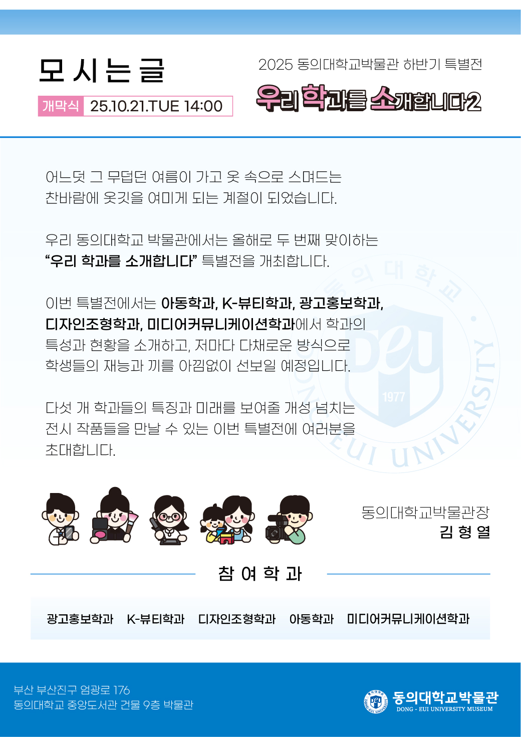우리 학과는 교내 박물관에서 진행되는 [박물관 특별전] ‘우리 학과를 소개합니다’ 전시에 참여합니다. 이번 특별전은 예비 대학생과 신입생에게는 각 학과의 특성과 비전을 소개하고, 재학생에게는 학과에 대한 자부심을 높이는 계기를 마련하고자 기획되었습니다. 특히 이번 전시는 우리 학과의 전문성과 진로 비전을 효과적으로 전달함으로써, 예비 대학생들에게는 진학에 대한 방향성을, 재학생들에게는 소속감과 자긍심을 고취하는 뜻깊은 시간이 될 것입니다. 많은 관심과 관람 바랍니다.