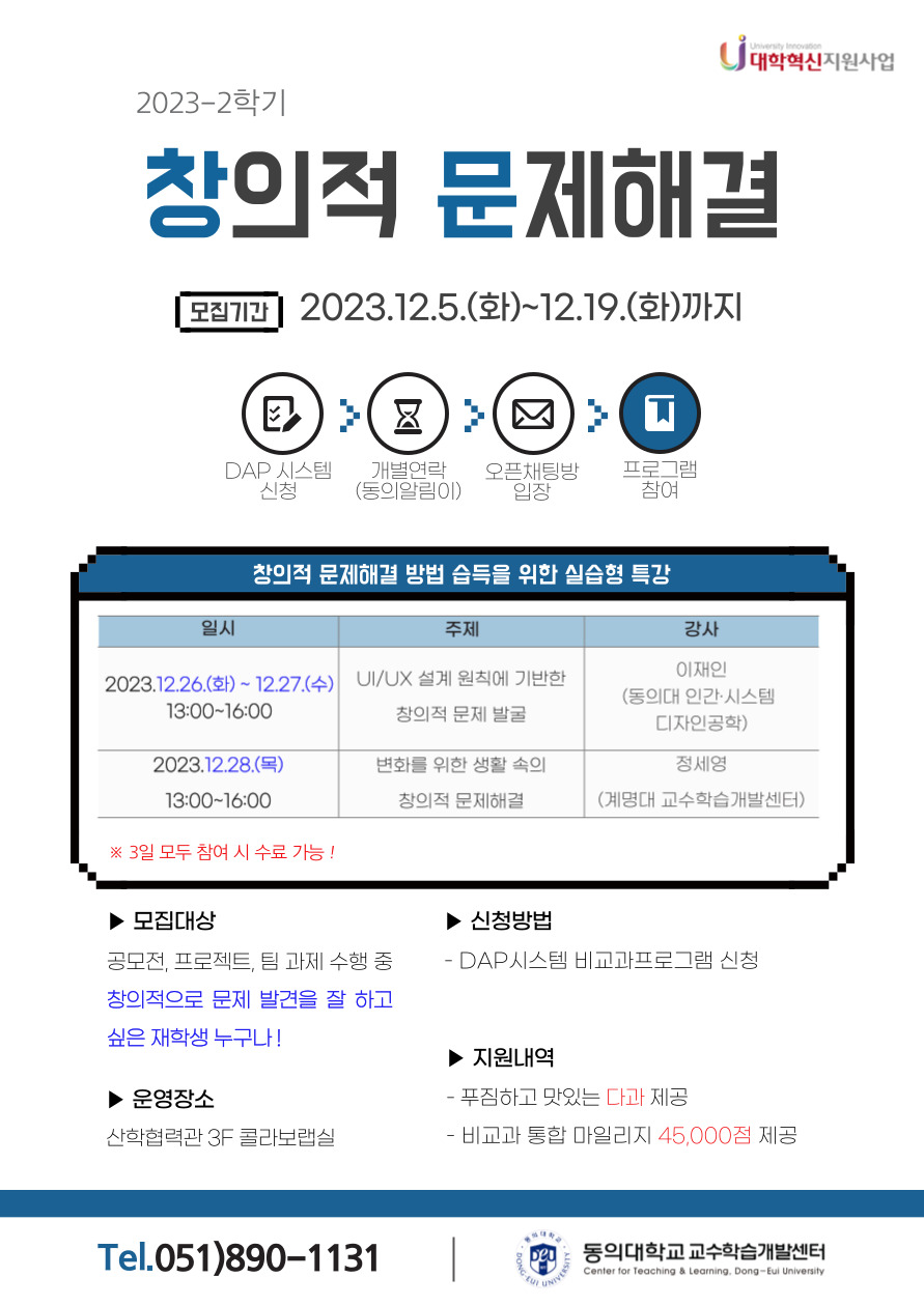 교수학습개발센터의 학습지원 프로그램인 2023-2학기 창·문(창의적 문제해결)을 다음과 같이 안내하오니 많은 신청 바랍니다.